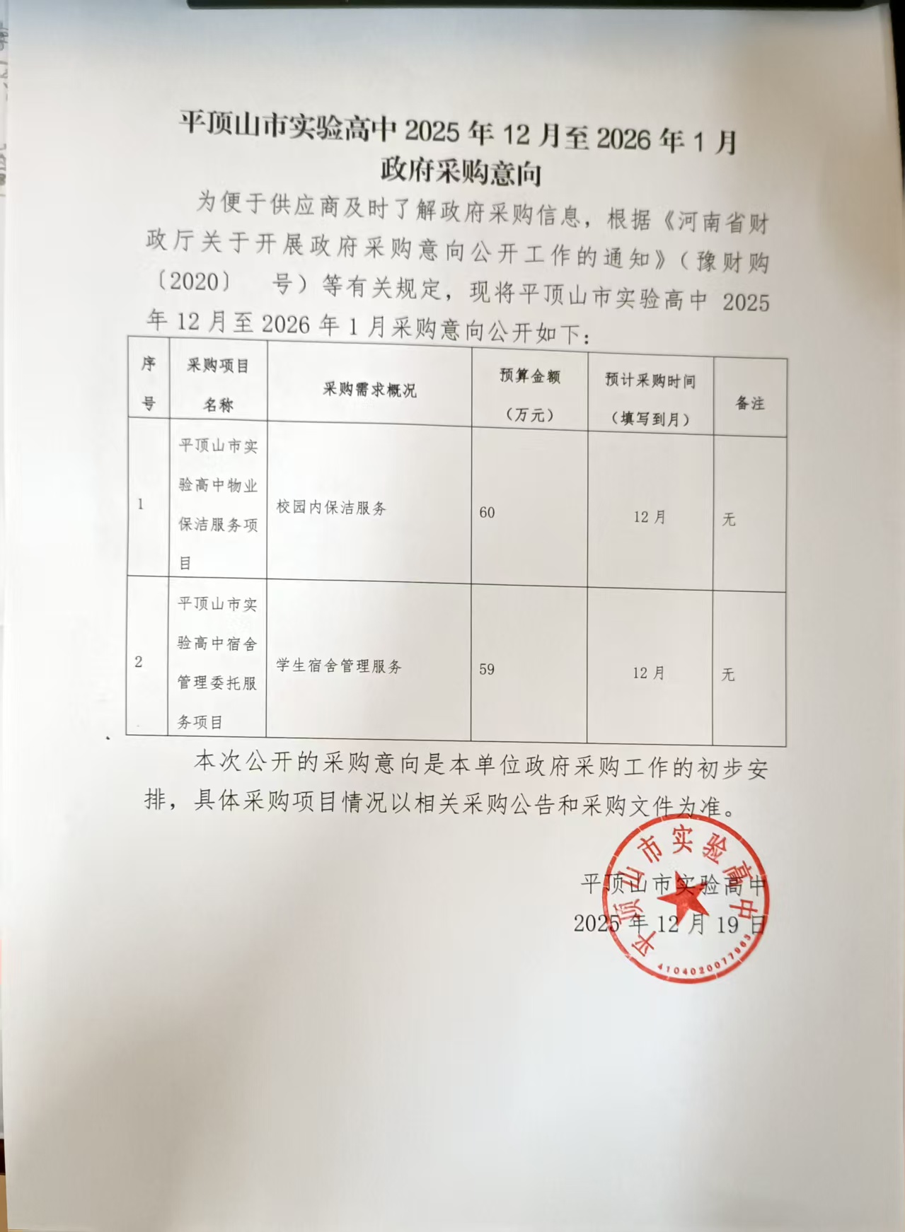 为便于供应商及时了解政府采购信息,根据《河南省财政厅关于开展政府采购意向公开工作的通知》(豫财购〔2020〕8号)等有关规定,现将平顶山市实验高中 2025年12(至)12月采购意向公开如下: